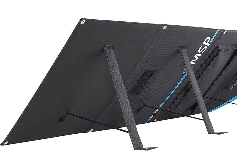 The extremely thin and lightweight solar modules of the MSP SunWallet series can be folded into a space-saving portable solar bag with an integrated handle and offer optimum storage space for accessories.