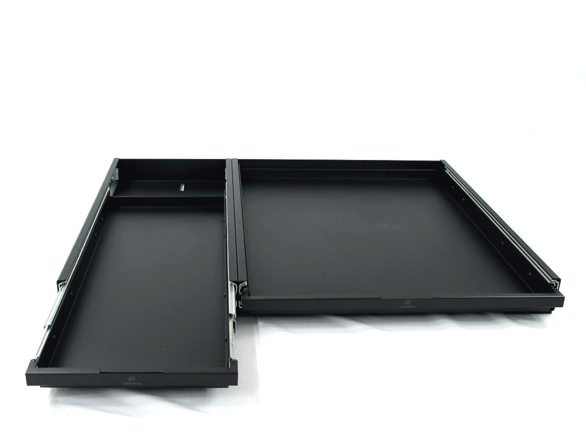 Customizable design: Large tray is on the right by default but can easily be swapped
