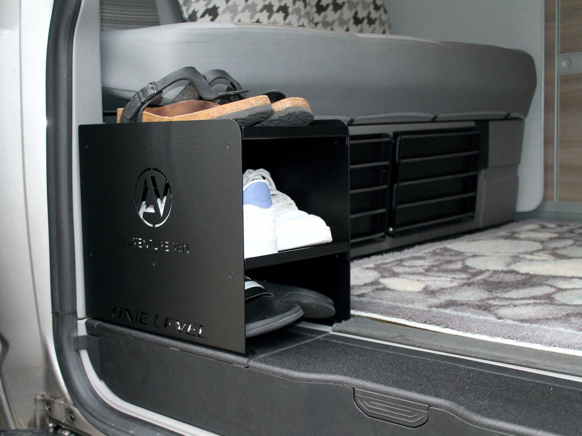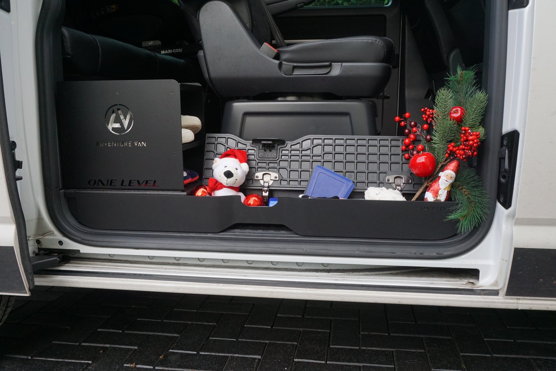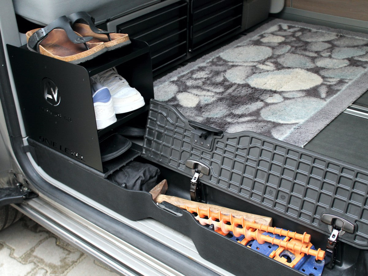 OneLevel is a removable insert that uses the empty space of the step in the Multivan as storage space. The space gained can also easily be used for loading or sitting. Designed and produced according to OEM standards in Germany.