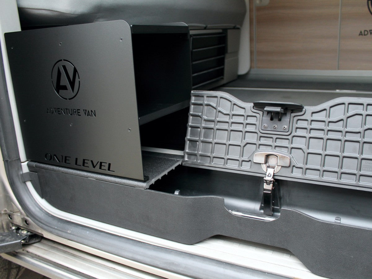 Are your shoes lying around on the bus because you haven't found the perfect spot yet? Then put an end to this chaos! With our shoe rack you can store your shoes neatly and at the same time generate storage space with a OneLevel step insert. Perfectly positioned on the sliding door, you have your shoes immediately to hand when getting in and out and you don't have to search for them for long.