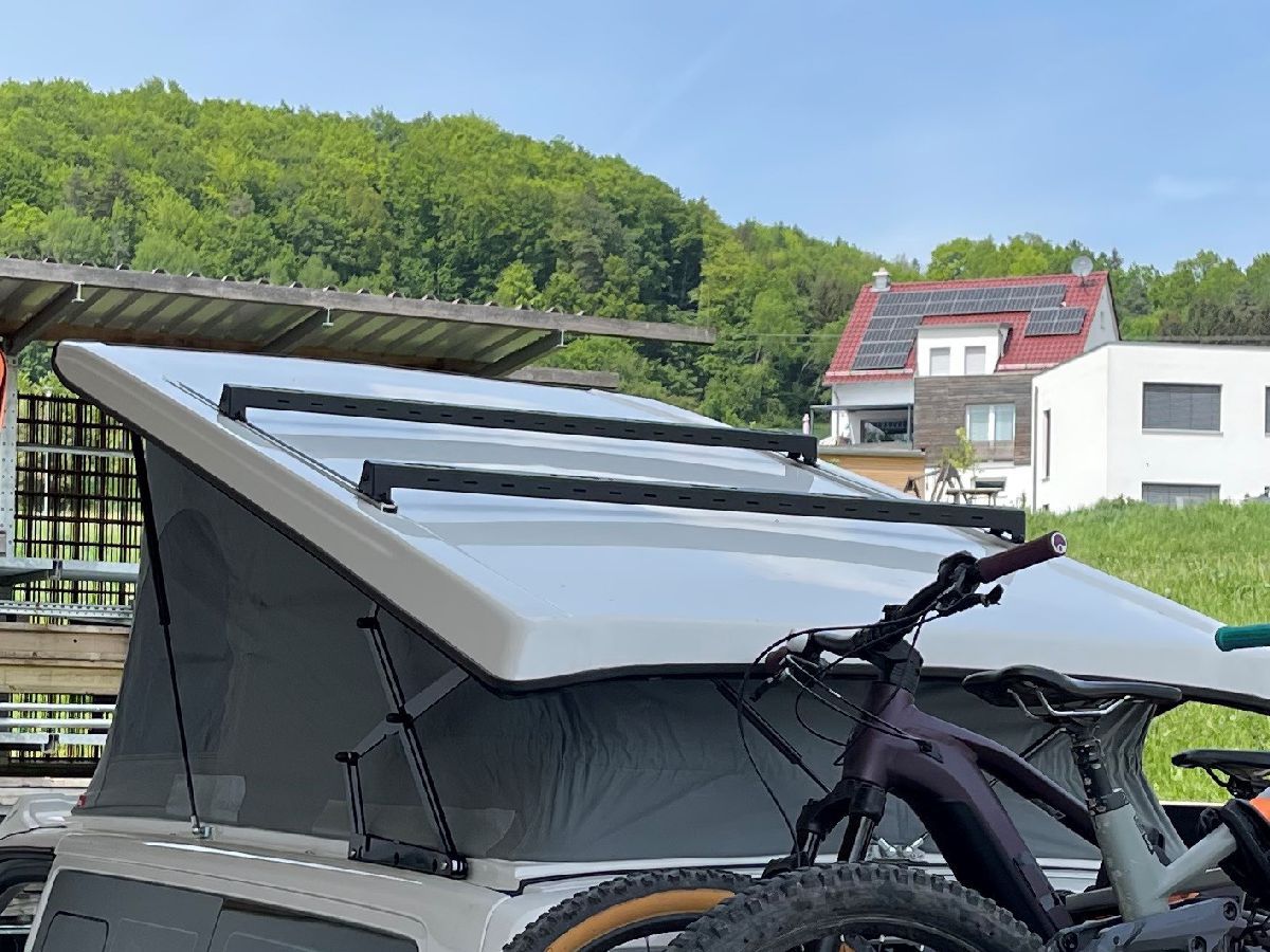✔ Easy installation – Simply slide the crossbars into the rails of the pop-up roof and secure them in the desired position