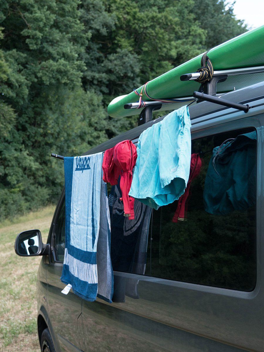 Looking for a practical clothesline for your VW Bus or campervan? This Adventure Van clothesline is the perfect solution for drying wet clothes on the road – right on your vehicle and with zero hassle.